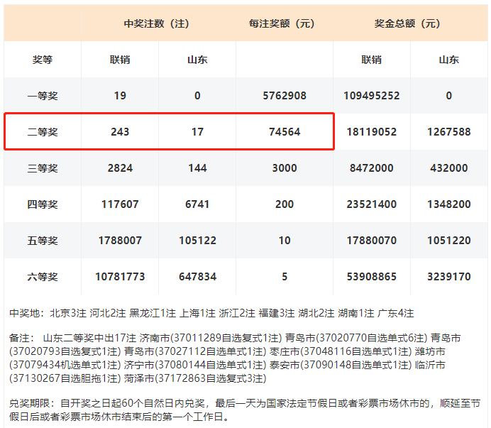 本期一等奖开出19注,单注奖金576万余元,19注头奖分落全国9地,其中广东中得4注,北京、福建各揽3注,河北、浙江、湖北分别中得2注,黑龙江、上海、湖南各中得1注。二等奖开出243注,单注奖金7.4万余元。本期筹集公益金1.29亿元,计奖结束后奖池余额20.31亿元。